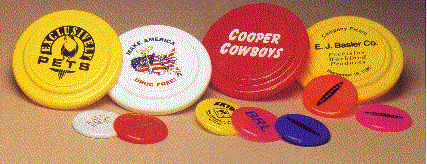 Pictured below are imprinte 9" and 4" flyers. We have these available in many colors and we even have have a flyer that is scented with chocolate. Yes, and we have a glow-in-the dark flyer available too ! Minimum quantity on the 9" size is 150 and the minimum imprintable quantity on the 4" size is 500.