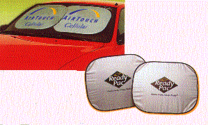 This Reflective Accordian-Fold Sunshade measures 24" X 58" and has silver mylar with polyfoam backing. It folds for easy storage and has an elastic strap. The picture below is of a four-color process imprint. Minimum imprintable quantity is 1000.