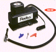 On the left is our Compact Air Compressor that is 7" X 5 1/2" X 3" and provides you with an imprint area of 4" X 1 3/8". It features a 250 psi air gauge, easy to read pressure gauge, 10" power cord w/on/off switch & cigarette lighter adapter and 3 inflation adapters. The minimum imprintable quantity is only 10.
