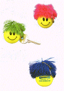 This lightweight 2" round plastic ball with smiley face, rubberized hair and keychain is great for schools, etc. Assorted colors only with an imprint area on back of head being 3/4" wide X 1/2" high. Minimum imprintable quantity is 100.