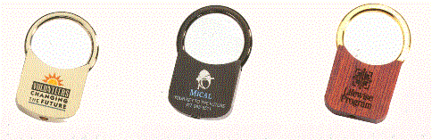 Here are three elegant and stylish keyholders with each of the three featuring a different keyholder finish. The one on the left is a silver twist-lock with etched and colorfilled imprint and an imprint area of 5/8" X 1/2". The middle picture is that of the gunmetal twist-lock keyholder also with an etched and colorfilled imprint and it also has the imprint area of 5/8" X 1/2". The Dymondwood twist-lock keyholder on the right features a laser engraved imprint and has an imprint area of 13/16" X 9/16". Minimum imprintable quantity on any of these three selections is 100 keyholders
