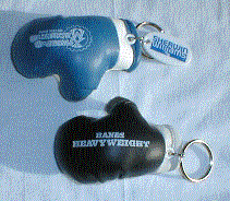 The Bxing Glove key chain is available in either Red, Blue or Black and measures 3 1/4" X 2 1/2" . The Punching Bag key chain is available in either Black or Red and measures 4 1/2" X 1 1/2" and it provides an imprint area of 2" X 1/2". Minimum quantity on either of these items is 300.