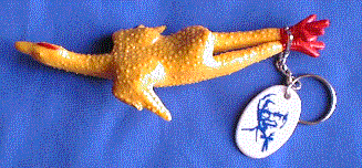 The Chicken key chain measures 6" X 2" X 1/2" and the imprint can be done with your custom imprint on the White oval disc. Minimum imprint is 300.