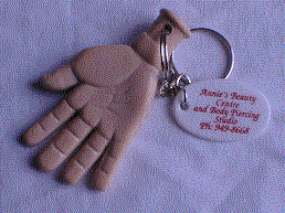 Our flexible Hand key chain is 2 7/8" X 1 5/8" and has an imprint area on the Whiteoval disc of 5/8" X 1". Minimum imprintable quantity is 300.