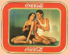 Johnny Weisimuller and Maureen O'Sullivan. the Thirties' Tarzan and Jane, appear on a 1934 tray. Drugstore Cokes were served in the classic bell-shaped Coca-Cola glasses etched with the logo. And of course the glasses deserved an appropriate way for delivery to the customers' table.
