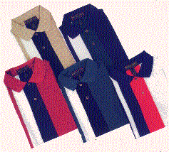 The picture on the left is a triple color block jersey which is 100% combed cotton heavyweight jersey. Fashion and knit collar and welt cuffs. Available in sizes of small thru XXL. The picture on the right is also a triple color block pique made of 100% pique knit with a three button contrasting placket. Available in sizes small thru XXL. Minimum imprintable quantity is only 12 shirts.