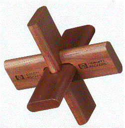 This imprintable Star Puzzle has three legs that interlock together in just one way to make the difficult seem easy. Laser your imprint on one side of one leg or we can laser all three legs if needed. Made from walnut these items are sure to be the talk of the office and present a unique opportunity to keep your company or organization name in front of your clients. The Star Puzzles are less than $ 12 each in the minimum quantity of 50.