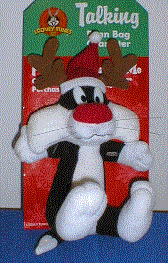 Here is Sylvester all ready for the yuletime holidays. He measures 7 inches from top to bottom. We can put either music or sounds in a chip and then can embed it in a custom bean bag for your company. For more information you can call 206 285-5359.