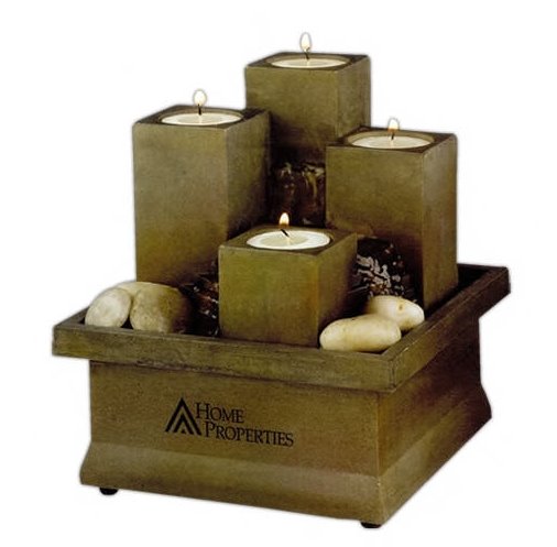 The 7 1/4" high X 6 1/2" wide X 6 1/2" depth 4 Pillar Tealight Fountain produces the soothing sound of moving water. It holds 4 tealights and decorative stones (included) The silent pump operation uses 2 AA batteries. Custom imprint area is 1" X 2 1/2". Minimum custom imprinted order is 25.