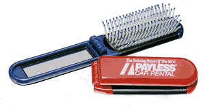 Compact and convenient, this folding brush with built-in-mirror is great for purse or pocket. Tips of brush are color coordinated to match the selected case colors of Black, Navy, Blue, Red, Green or Ivory. Imprint area is 3" wide X 3/4" high and the minimum imprintable quantity is 100.