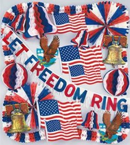 The #55706 Patriotic Decorating Kit is $ 52 and consists of 3 - 10" - ArtTissue Bells, 2 - 14" Art-Tissue Balls, 3 - 18" Flag Cutouts, 2 -18" Liberty Bell Cutouts, 1 - 8 1/2 foot Let Freedom Ring Banner, 1 - 20" Art-Tissue Bell, 2 - 25" Art-Tissue Fans, 2 - 25" Flag Cutouts, 2 - 18" Eagle Cutouts, 4 - 12 foot Arcade Garlands.