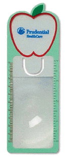 This 7 7/16" X 2 5/8" magnifier is also a handy bookmark, page holder and ruler.It provides an imprintable area of 2" X 2". In the minimum of 250 it is less than $ 1.60 each.
