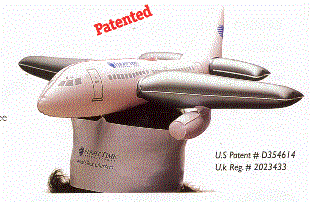 This airplane actually rests on top of a hat as pictured below. The size of the plane is 18" X 18" (size of plane w/o headband) 3 1/2" high X 25" long (headband). The imprintable area on the headband is 3" wide X 1 1/4" high (on headband) and the airplane can be imprint in the same areas and dimensions as the aforementioned inflatable airplane. The minimum imprintable quantity is only 50 !