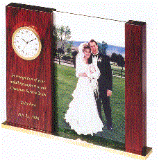 A precision analog clock that is surrounded by Dymondwood with a solid brass base, makes this perfect for the most important recognition and gift-giving occassions.The frames are provided with a black acrylic panel behind the photo panel which may also be used as an imprint area. In the picture below the photograh of the wedding couple covers this up. The photo size of this area is 5" X 7" with the actual item being 9" X 7 5/8" X 1 1/4". Your imprint would appear under the clock. Minimum quantity is only two with a custom imprint.