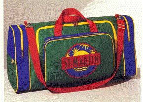 This colorful multi-compartment duffle bag has an adjustable detachable shoulder strap, circular front opening, zippered end compartments with diagonal side zippered compartment, black plastic hardware and welt. It is a 25 1/2" length by 11 3/4" high X 7 1/2" to 9 3/4" deep. It is available in 400 denier nylon pack cloth, laminated cotton duck and cordura nylon. It is available in colors of your choice and has a silk screen imprint area of 10" X 7" or an embroidery area of 6" X 6". The minimum imprintable quantity is only 50.
