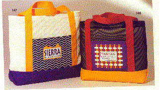 We have many types of bags available available in various color combinations, materials and imprinting methods. We are presenting just a few of our bags below. For specific needs please contact us at 800 960-9080 or 206 285-5359 (Seattle) and we will be glad to send out a catalog of your choice. Please call us at 800 960-9080 or 206 285-5359 (Seattle) Our email address is donace@promotionalproductsandideas.com or don_shepherdson8@msn.com
