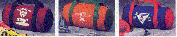 We can imprint many different types of athletic bags for all types of sports. Illustrated below are three of our most popular types of bags. On the left is a Round duffle with wrap around handles. This bag measures 8 1/2" X 15" and features an imprint area of 6 1/2" X 6 1/2".. The bag in the middle's dimensions are 9" X 17" and has an imprint area of 6 1/2" X 6 1/2". The bag on the right is a 10" X 20" with an imprint area of 8" X 8". Minimum imprintable quantity is only 24 and these bags are available in many different color combinations.
