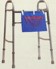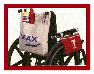 Pictured on the left is a 17" X 12 1/2" X 3" Wheelchair Tote that fits on the handle bars of a wheelchair. It provides an imprint area of 11" X 8". The Walker Tote can be hung on the arm of the wheelchair or on the bar of the walker. The size is 14" X 7" with an imprint area of 9" X 3 1/2". These backs are both available in either natural duck, nylon or colored twill. Minimum imprintable quantity is 100.