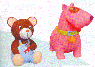 The Bear Bank is 3 3/8" long X 3 5/8" wide X 5 3/8" high with an imprint area of 1" wide X 3/8" high. The Crazy Canine Dog Bank is 9" long X 3 3/4" wide X 7 1/2" high with an imprint area of 1 3/8" wide X 1/2" high. Both banks have a minimum of 50 and are made of hard rubber with a coin slot and a removable bottom disk. The Bear Bank is less than $ 3.90 each in the minimum of 50 and the Crazy Canine Bank in the minimum of 50 is less than $ 5.80 each.