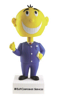 Here are two stock Bobbleheads that can have your imprint on the base and the minimum quantity is only 100. They are about 5 1/2" high and each provides an imprint area of 1 3/4" X 1/2". Available for quick shipping.