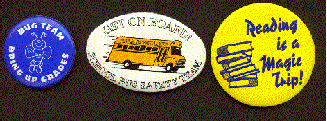 We have many sizes and shapes of buttons availble. We are able to do quantities as low as 50 buttons in a weeks time or less. We are able to provide both celluloid buttons and the less expensive lithographed buttons and tabs in larger quantities for your needs. Lithographed buttons are actually printed right on the metal finish while celluloid buttons are printed on paper and then a celluloid cover is inserted over the paper. Sizes range from 1" to a 9" button with many sizes in between. We offer one week or less delivery on many of our celluloid buttons ! For a free catalog on buttons call 800 960-9080 or 206 285-5359 (Seattle) or email us at donace@promotionalproductsandideas.com or don_shepherdson8@msn.com