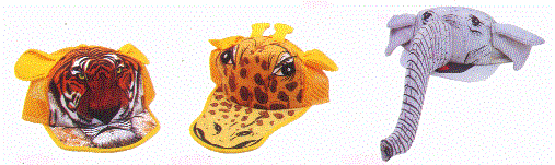 Pictured from left to right we first the Tiger Cap with a minimum quantity with-out an imprint of one dozen, in the middle the Giraffe Cap has a minimum of one dozen and on the far right we have the Elephant Cap also with a minimum quantity of one dozen.