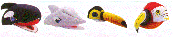 Pictured below from left to right are the Killer Whale, Dolphin, Toucan and the Parrot cap all with a minimum quantity of only one dozen.