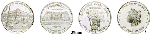 The Nickel-Silver coins look like fine silver. Nickel-Silver is a heavyweight alloy made of a special blend of nickel, copper and zinc. Although it contains no precious metal, it is bright silver in color, scratch resistant, non tarnishing and very durable. The Nickel-Silver coin is available in only the 39mm size with the minimum quanity is 1000.