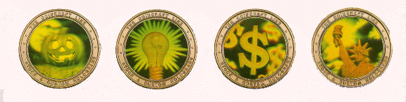 Our Hologram coins have realistic three-dimensional images that are great for attracting attention to your next promotion. Our Hologram coins start with a 39mm 10 Gauge Goldine coin, die struck on one side with a hologram affixed to the other side. Hologram coins are the perfect high impact visual for new product introduction, added value to employee recognition awards, brand enhancement for traffic builders, and will security to gift certificate and coupon programs. Both one and two sided holograms are offered. There are 20 stock holograms are a custom hologram can be done for your coin. Minimum order is for 1000 coins.