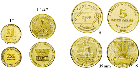The Golden Brass Coins have a high perceived value. Available in sizes of 1", 1 1/8", 1 1/4", 1 1/4", 34mm and 39mm. The minimum custom imprint quantity is 1000.