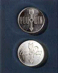 We have several stock Mardi Gras, Anniversary and other coins that can be shipped without any special custom imprint. The Spinner coins are custom designed most often with a choice of You Win or You Pay along with your custom imprint on the back side of the coin.