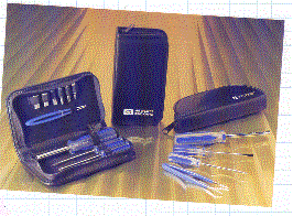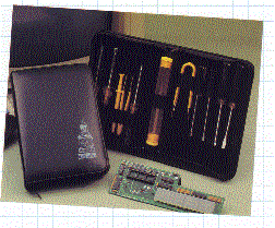 These are the perfect item for anyone in the computer technical or high-tech fields. Also useful in small businesses, educational instituitions and offices.. The kit on the left contains all the most needed tools for servicing other peripherals such as printers and other electronic equipment. The tools feature high impact plastic handles and chrome vanadium steel shafts. The kit has a 3/8" nut driver, 3/16" nut driver, 3 prong parts retriever, 4 3/4" tweezers, T-15 torx driver, IC extractor, 1/8" slotted screwdriver, 3/16" slotted screwdriver and plastics small parts tube with rubber caps.. The imprint area on the front of the case is 3" X 4". The minimum imprintable quantity is only 5. The picture on the right features two different kits. The one on the left has a 1/4" nut driver, 1/8" flast screwdriver, #0 Phillips screwdriver and tweezers in the 7" X 2" kit. The kit on the right features a bit driver handle, 1/8" flast screwdriver, #0 Phillips screwdriver, tweezers, and the following bits: #15 torx, 3/16" flast, #1Phillips, 1/4" socket adapter, 1/4" socket and 7/32" socket. The case is 7" X 3 1/2". Minimum imprintable quantity on both of these is also 5.