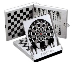 Comes in an aluminium box and can be used for both darts and backgammon. It measures 6 3/4" X 6 1/4" X 7/8" and provides an imprintable area of 1 3/8" X 1/2". Minimum imprintable quantity is 25.
