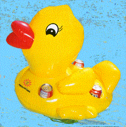 This a great item for backyard swimming pools, at the lake or the ocean to keep your favorite beverages cool. The Duck floating beverage container measures 22" wide X 23" high X 24" long. It provides 4 can holders on top for opened beverages plus a place for snacks. Underneath, it has an easily accessible vinyl mesh bag that can hold up to 12 cans of bevarages while floating in the water. These are great items for corporate awards, picnics, hotels, resorts, private clubs, the travel industry and pool and spa users. Minimum imprintable quantity is only 50 and the price is less than $ 10 per unit. For all pricing and further information you are invited to give us a call at 206 285-5359 or email us at donace@promotionalproductsandideas.com
