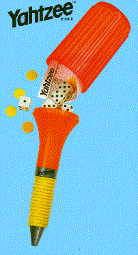 The Yahtzee Micro pen has just what you need for an exciting game of Yahtzee and provides an imprint area on the pen of 1/2"X 1/2". The Lincoln Logs Micro pen has 40 pieces for constructing whatever you may desire and it has an imprint area of 1/2" X 1/2" and the Twister Micro pen is ready for a mini game of Twister and it provides an imprintable area of 3/8" X 5/8".