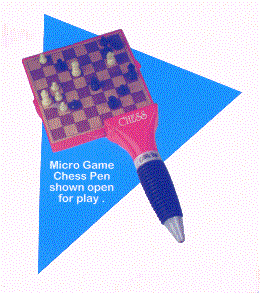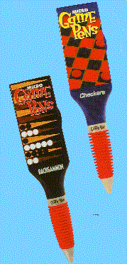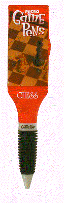 We are pleased to be able to present our Micro Game Pens that can be custom imprinted with your company name or organization's name. Available in 18 different games with the game attached to the pen these pens are certain to be the pen of choice for not only game players but also those that are looking for a truly unique writing pen for their business or organization. The minimum non-imprinted quantity on the pens is only 24. For a custom imprint the minimum is 500 pens..