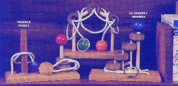 Here are three of our must popular Mind Bogglers. From left to right we have the Trouble Puzzle, the Triple Puzzle and the Quadruple Puzzle. Each of the three items is about 8" X 1" and the minimum imprintable quantity is 150.