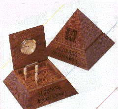 The mysteries of the pyramids are continued in this beautiful and eye-catching walnut pyramid. The hinged top portion pivots back to reveal a relaxing game of peg solitaire, and in case you get too involved, the golden quartz analog clock is ready to gently call you back to work !. The wooden pegs for solitaire are included. The size is 4 1/2" X 4" and the laser imprintable area is 3" X 1". The minimum custom imprintable quantity is only 12.