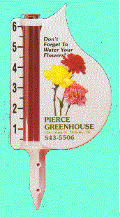 This 6" standard tube rain gauge is a real hit with both gardeners and nurseries. The actual size is 5" X 10" and the imprint area is 3" X 4 1/2" and the minimum imprintable amount is 100. You can have a four color process imprint on this item and it looks great.