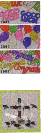 The top 3 pictures show #1041 Good Luck, #3960 Balloons and #3961 Congratulations Confetti and the bottom picture is the # 6830 Cascade Centerpiece that measures 18" and is made up of Morterboard Cap Cascades and is great for table centerpieces.