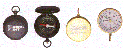 On the left is our black plastic liquid filled compass with a snap open lid and ring. 40mm diameter. Gift boxed. On the right we have the Open face compass in brass color with a key ring attachment. The diameter is 1 3/4" and comes with a gift box. Minimum imprintable quantity is 48.