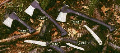 Here are several great items for our outdoor folks. At the upper left is the Camp Axe with a 2 1/2" blade length on a 17 1/2" long handle. The blade thickness is .750 inches and weighs 2 1/2 pounds. The middle sport axe has a 1 3/4" blade length on a 13 7/8" long long handle with a blade thickness of .675 in and it weighs 1 1/12 pounds. The axe on the right called the Back Paxe has a blade length of 1 3/4" on a 8 7/8" handle with a blade thickness of .675 inches and weighs 17.5 oz. On the bottom the Sport Saws have a blade length of 6 1/4" and the overall length is 14 1/2" and they weigh 8 oz. Imprinting is laser engraved on the handles and a minimum imprintable quantity is one.