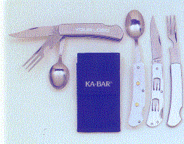This is a complete outdoor dining set in 100% stainless steel that opens from a compact 4" folded unit to an individual fork, knive and spoon. It easily slides apart and together again and fits into a 2" X 4 1/2" nylon web sheath that can be carried on the belt or in a pocket. The knife alone is a slim, lightweight lockback that can be used as a pack knife. 4" closed. Comes with a full sewn and sturdy nylon web sheath. The imprint area is 2" wide X 5/16" high. Minimum imprintable quantity is 25.