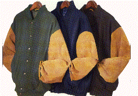 The varsity jackets pictured below are wool with suede sleeves. They have two double welt leather slash pockets, 100% quilted nylon lining with polyester fiberfill and knit cuff and waistband and collar. Available sizes of S-XXL. The varsity jackets are available in the following colors: Green body with brown sleeves, Navy body with brown sleeves and Black body with brown sleeves.