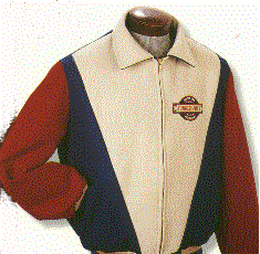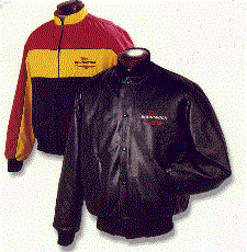 Pictured on the left is a Supplrx nylon tri-color jacket with contrasting cordage between panels, zipper closure, matching knit trim and waistband and nylon lined.Colors shown on this jacket are black, scarlet and light gold. Minimum of 300. The black jacket on the right is made of genuine cowhide with set-in sleeves. It features a stand up-knit collar, cuff and waistband as well as a strap front and quilt lining. Minimum quantity is 12.