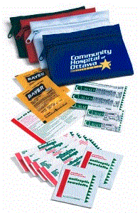 This personal first aid kit has a zippered nylon case that holds Bayer aspirin, bandages, antiseptic towelettes and a first aid guide. This is an ideal item for mailing and conventions. It measures 4 7/8" X 3 1/2" and the minimum imprintable quantity is 150.