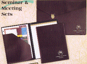 Portfolios are one of our most popular items for meetings, conventions, seminars and retreats. Below we have a Economy Snap Portfolio that measures 14 5/8" X 11". It features a brass snap to keep your importmant papers securely in place. Beneath it is the Zip Lock Portfolio that features a unique watertight, plastic zip lock closure with pull tab. It measures 14" X 10 1/4". Both of these portfolios are available in a variety of colors. Minimum imprintable quntity is 100.