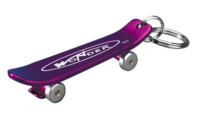 This aluminimum replica Skateboard key chain is available in anodized colors of Purple, Blue, Green and Black and it measures 3 1/2" X 3/4" X 3/4". The imprint on the skateboard is 1 1/2" X 3/8" and the minimum imprintable quanity is only 50.