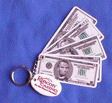 The Money Key Chain has replicas of a $ 5, $ 10, $ 20, $ 50 and $ 100 bills and they are movable into different positions. The size of the item is 3 1/4" X 1 3/8" and the imprint area on the White disc is 1" X 5/8". Minimum quantity is only 300.