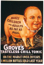 Here is a typical patent medicine ad from 1880. In Grove's day healthy equalled being plump.. As there wasn't a way to get color register in mass-produced newspapers or magazines, colored ads came from hand-fed lithograph and job presses. Thus advertising was limited to trade cards, multi-sheet posters and counter cards like this one.
